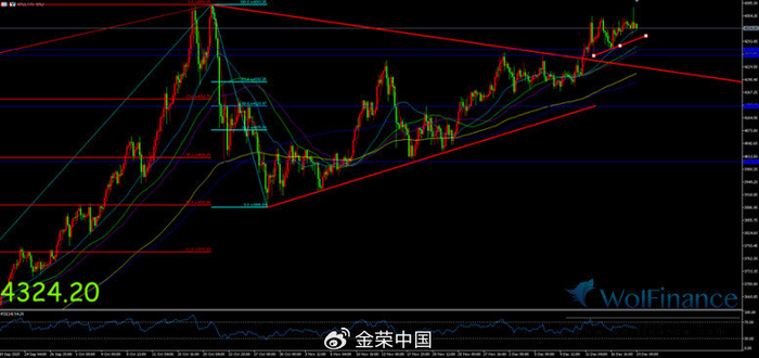 国际黄金周四冲高回落维持震荡走势,周四早间金价最高上探4342一线后短线震荡走低,亚盘时段金价最低下探4324一线后小幅反弹企稳于4329-4337区间震荡。进入下午盘金价扩大短线跌幅逐步企稳于4321区间震荡,美盘初期金价小幅下探4314一线后触底反弹,美盘金价加剧短线震荡走势最低下探4309、最高上探4374一线后快速回落,周五凌晨金价最低下探4322一线后小幅反弹回踩4341后逐步企稳收盘于4332一线。日线录得影线交长小幅阴线,整体日线移动平均线维持较为规整向上分散排列,维持日线级别多头趋势指引参考,短线冲高回落逐步带来日线RSI自超买回落。小时级别显示,短期金价冲高回落企稳于小时级别60日均线支撑位一线,短期支撑位整理走势或继续加剧短线见顶走势,小时级别移动平均线呈粘合收窄表现,维持震荡趋势指引参考,小时级别RSI自超买回落维持均值整理。四小时级别冲高回落形成较长上影线见顶K线组合,短线企稳于四小时20日均线支撑位一线,整理走势横盘周期的延长破位下行风险预期逐步上升。短期金价冲高回落破坏原有高位整理多头持续,加剧短线见顶表现,谨慎下调短线支撑预期维持逢低多交易思路。