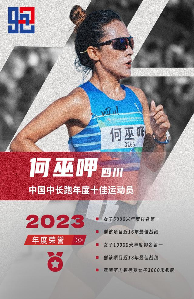 何巫呷,1998年出生,来自四川。省队教练韩刚指导,国家队教练李犁指导。本赛季女子5000米、10000米两项年度排名第一。