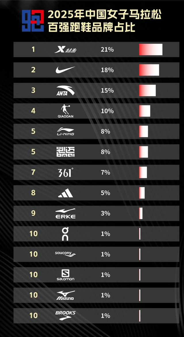女子百强榜单同样是14个品牌上榜,特步以21%的占比,连续3年蝉联榜首。自2023年首度超越外资品牌后,特步稳固住了这种局势。耐克以18%位列第二、安踏以15%位列第三。