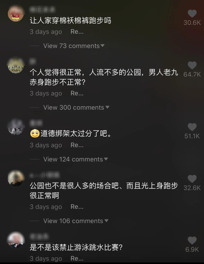 他们认为,公园作为一个公共生活区域,应保持整洁有序的形象,而光膀子跑步可能给他人带来不适。此外,某些人认为这是对公众礼仪和文明习惯的挑战。