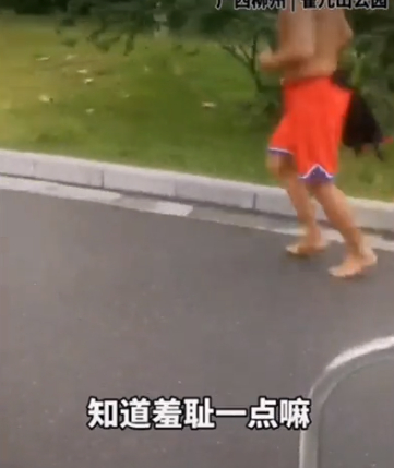 在广西某公园,一名男子光膀子进行晨跑,工作人员紧跟在男子身后,不断地提醒他把衣服穿起来,而男子则回答称自己是在跑马拉松。