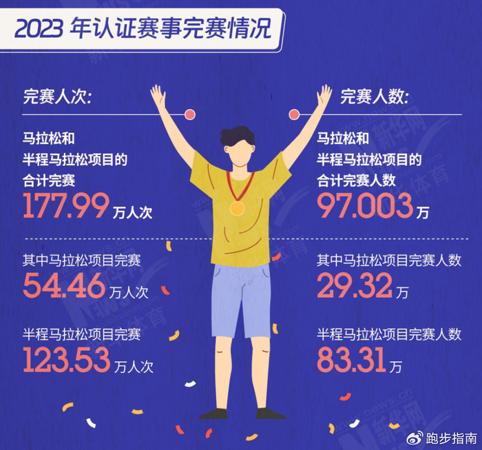 2023年马拉松和半程马拉松的参与热情显著升温。马拉松与半马的完赛人数更是达到了97.003万人,这一数字不仅反映了跑步运动的普及程度,也标志着国民健康意识的持续提升。