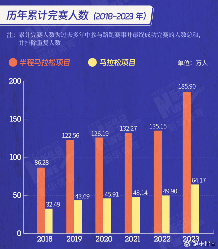 从2018年至2023年,马拉松和半程马拉松的完赛人数均呈现出逐年上升的趋势。具体而言,马拉松项目的累计完赛人数已高达64.17万人,而半程马拉松的累计完赛人数更是达到了185.9万人。