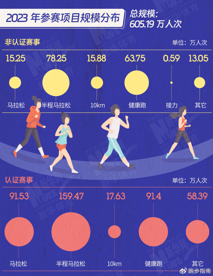 2023年参赛总规模达到了605.19万人次,其中半马参与人数最多。