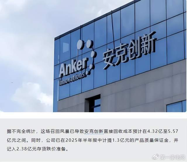 据不完全统计,这场召回风暴已导致安克创新直接回收成本预计在4.32亿至5.57亿元之间。同时,公司已在2025年半年报中计提1.3亿元的产品质量保证金,并记入2.38亿元存货跌价准备。