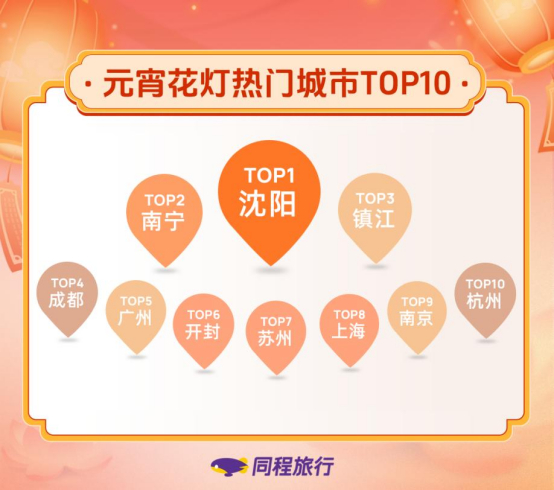 同程旅行数据显示,今年元宵灯会热门TOP10城市分别是:沈阳排名第一,其次是南宁和镇江,成都、广州、开封、苏州、上海、南京和杭州紧随其后。
