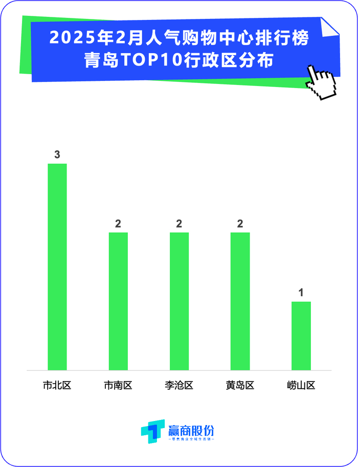 各占1席:市北区的台东商圈(利群商厦)、新都心商圈(青岛凯德MALL新都心);黄岛区的朝阳区商圈(青岛东方影都融创茂)、积木悬商圈(永旺梦乐城青岛西海岸新区);崂山区的浮山后商圈(青岛崂山万象汇);市北区的人民路商圈(青岛悦荟广场)