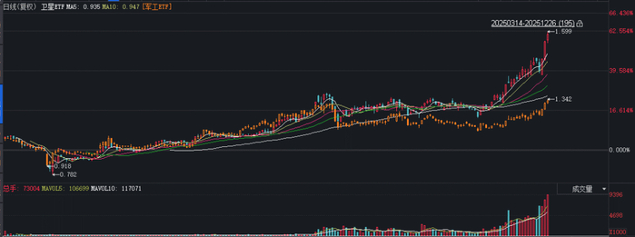 可以看到,8月份以后,卫星ETF(正常K线)与军工ETF(橙色K线)之间的差距越拉越大: