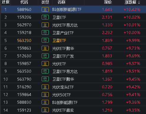 前14的ETF,今天涨幅都在9%以上。其中卫星、光伏都有ETF涨停,还有一只超过10CM。
