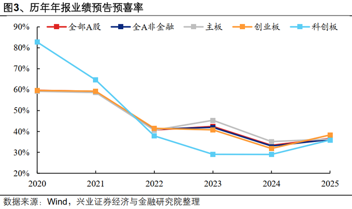 从上市公司整体业绩来看,从21年到24年,全部上市公司业绩预告是越来越悲观的,而25年年报预告相比24年要更加乐观。