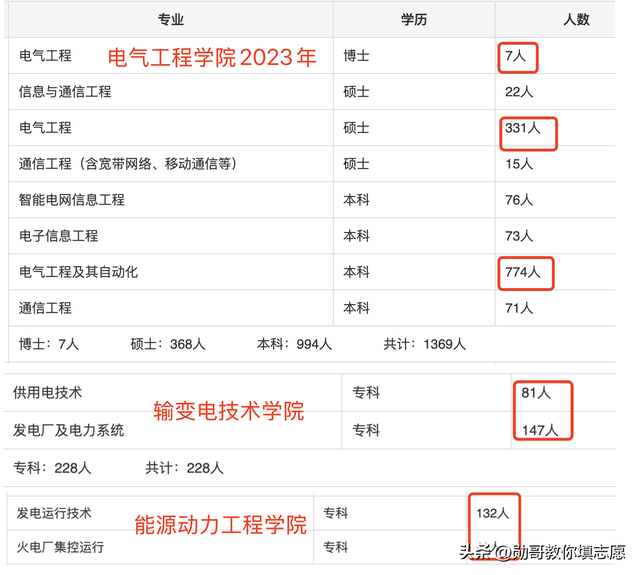 只是粗略算算,并没有包括能源动力相关专业,也没有把其他专业人数算下来,单以红框中的人数进行核算,2023年毕业生与电直接相关的人数有本科1105人,专科371人,一共有1476人。