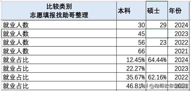 从就业人数及占比来看,本科计算机就业占比,急剧下降,2021年为46.81%,到了2024年仅剩为12.45%,硕士人数及占比,从22年和24年的数据来看,基本保持稳定,这个数据或许说明,本科计算机系的就业出现了意想不到的情况。