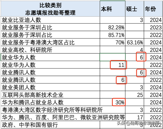 24年去华为和腾讯的本科生占就业总人数的30%,24年本科生就业一共30人,折算一下有9人去华为和腾讯。但据2022年的数据来看,一共有11人去华为,6人去腾讯,总计15人。24年本科生一共241人,22年有157人,从总数来看,24年占比是下降的。