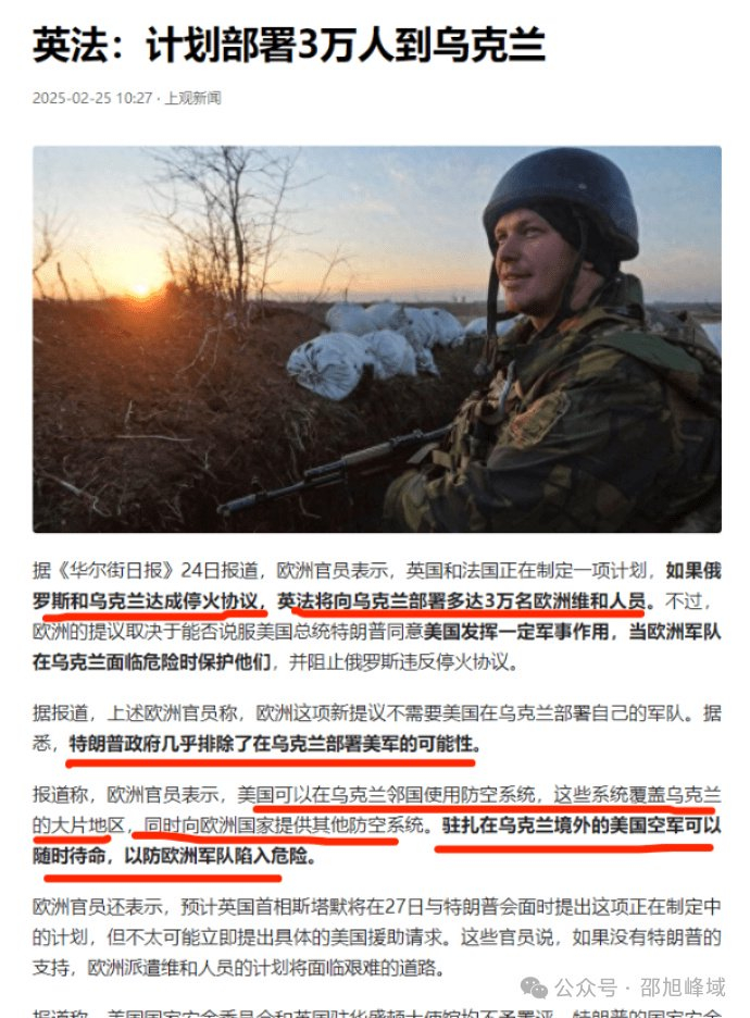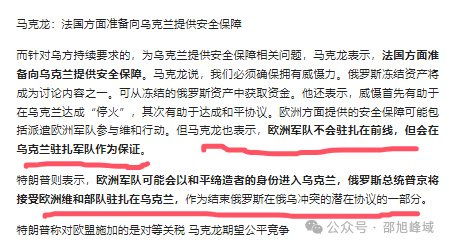 详细可点击链接或者复制搜索: 泽连斯基现在真谁都不怕,俄乌战争最终会如何了结?也不知道这是第多少次预断准确了,几十次有了——还是那句话,关于俄乌战争、以色列和伊朗关联动态的预断,这个球上应该再····· 关于之前的相关预断,可以回看,点击或者复制搜索下文:预断美国大选第n次准确,之后美国将搞印太战略和伊朗,然后呢? 别的懒得归总,有心者可以自己查找。 另外,关于欧洲国家可能会驻军乌克兰的动态也在进一步逼近之前的预断,根据央视新闻的最新消息,24日,法国总统马克龙访问美国,之后和特朗普对记者声称:欧洲方面提供的安全保障可能包括派遣欧洲军队参与维和行动···欧洲军队不会驻扎在前线,但会在乌克兰驻扎军队作为保证。