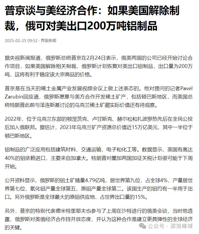 关于双方控制线,可能会以乌克兰退出俄罗斯库尔斯克等地区、俄军退出赫尔松和扎波罗热的部分地区——也就是基本回到战前控制范围。 还有,说过n遍了,如果要停,大帝的第一诉求,是保证自己和自己团控制的安全、其次是利益最大化,也就是想办法要美国和欧洲保证不过于“影响”到自己的民众、怕越来越管不住,然后就是让美国和欧洲解除部分制裁,可能会和美国会做生意,大帝说俄罗斯有200万吨铝可供美国,还可以和美国一起开发自己的稀土,包括顿巴斯地区的——要以这个让美国不要迫使自己退出顿巴斯····