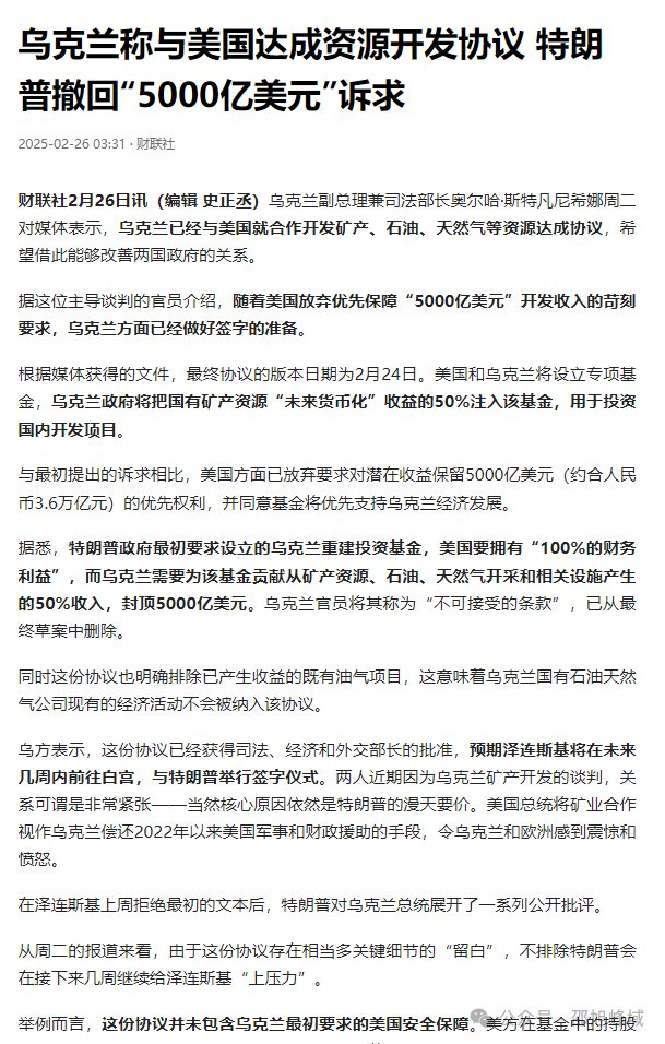 这则消息也完全验证了个人几天前(2月21日)的预断,下面是预断截图,我说特朗普的要价是给乌克兰留下还价余地的,协议也会签署。