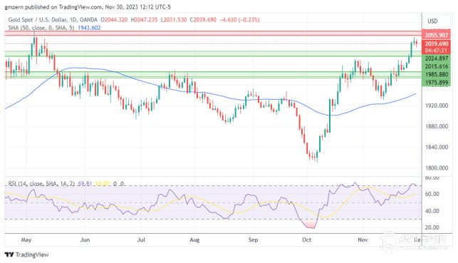 黄金最近的支撑位位于2015-2025美元区间。跌破2015美元水平将为测试下一个支撑位1975-1985美元打开道路。