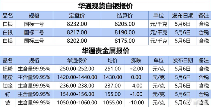 上海华通现货白银定盘价、贵金属报价(2025-05-06)