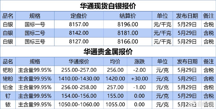 上海华通现货白银定盘价、贵金属报价(2025-05-29)