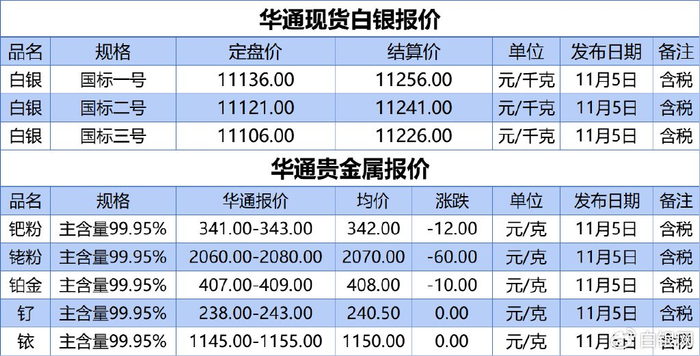 上海华通现货白银定盘价、贵金属报价(2025-11-05)