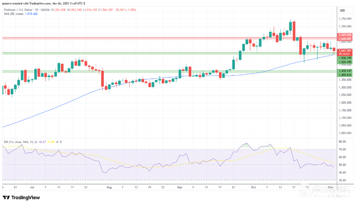 铂金在贵金属市场普遍回落的背景下走低。目前,铂金正试图收于1520-1530美元支撑位下方。
