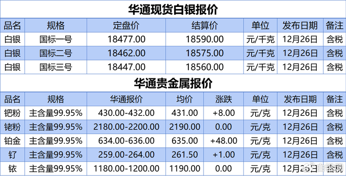 上海华通现货白银定盘价、贵金属报价(2025-12-26)