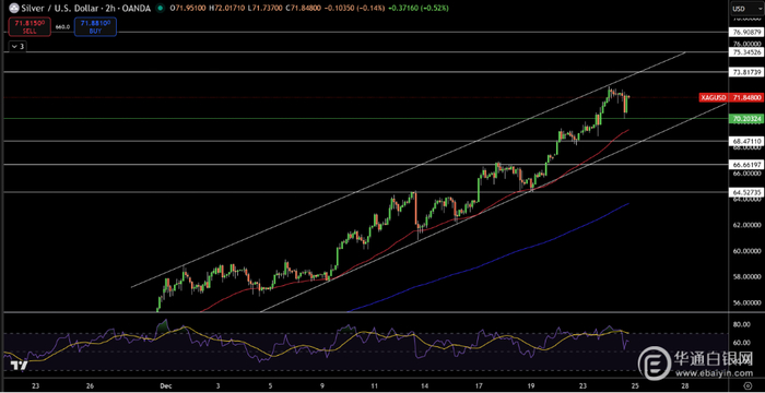 白银2小时图当前持稳于71.85美元附近,该价位反映了12月25此技术形态对市场重新开盘后的走势具有参考意义