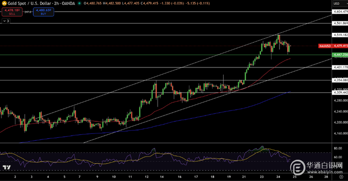 黄金接近4,479美元,瞄准4,520美元,同时维持4,450美元支撑位;银价报71.85美元,瞄准73.80美元,70.20美元支撑位限制下行空间,