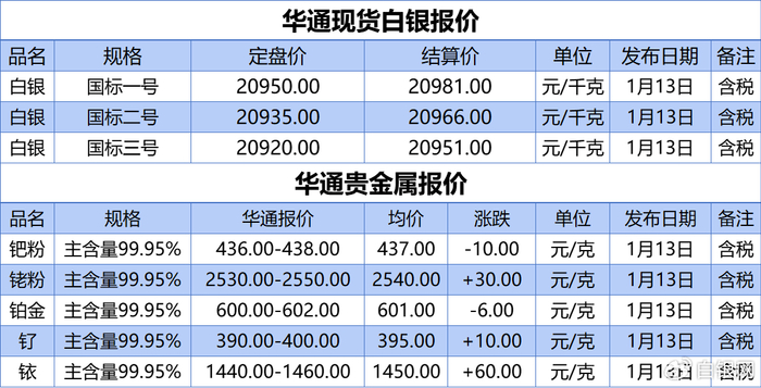 上海华通现货白银定盘价、贵金属报价(2026-01-13)