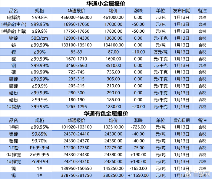 上海华通小金属、有色金属报价(2026-01-13)