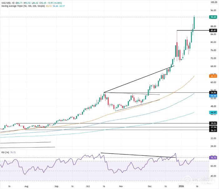 周三,银价大幅上涨,突破了每日低点86.91美元后创下新高,达到93.52美元的历史新高,并且短期内似乎有望突破100美元大关。截至撰写本文时,白银价格为93.05美元,涨幅超7%。