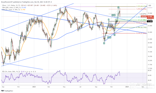 【华通白银网12月5日讯】在周一早盘触及25.91美元的新趋势高点后,银价逆转走低,引发了一个非常广泛的场外交易。截至撰写本文时,当日的最低价格是24.40美元,当日交易范围超出了前四天的交易范围。早些时候的最初反弹在25.70美元完成了ABCD模式的延伸。这是反弹的AB段被斐波那契比率127.2%延伸的地方,定义了CD段的目标。
