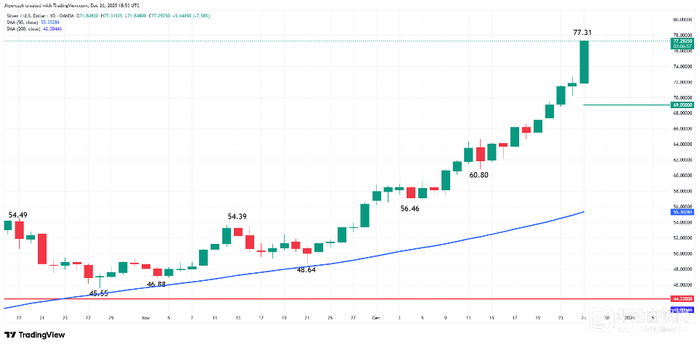 自11月21日触及48.64美元低点以来,白银已累计上涨超过28.67美元。鉴于当前强劲的上涨动能,投机者似乎正意图提前挑战2026年100美元或更高的目标价位。