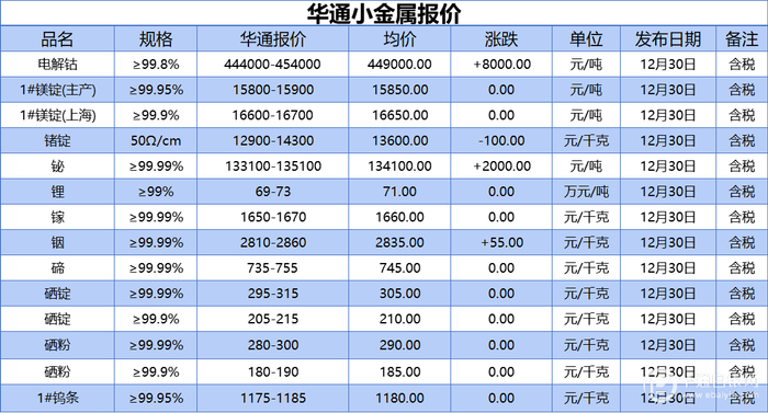 华通白银网 12月30日讯:电解钴、1#镁锭(生产)、1#镁锭(上海)、锗锭、铋、锂、镓、铟、碲、硒锭(99.99%)、硒锭(99.9%)、硒粉、硒粉(99.9%)、1#钨条报价