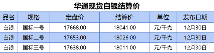 上海华通现货白银结算价:一号国标、二号国标、三号国标如下:
