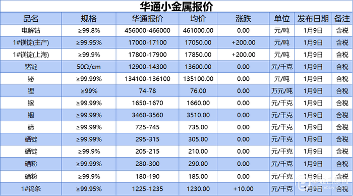 华通白银网 1月9日讯:电解钴、1#镁锭(生产)、1#镁锭(上海)、锗锭、铋、锂、镓、铟、碲、硒锭(99.99%)、硒锭(99.9%)、硒粉、硒粉(99.9%)、1#钨条报价