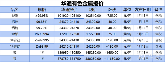 华通白银网 1月13日讯:1#铜、铝锭(99.85%)、铝锭(99.70%)、1#铅、1#锌、0#锌、镍、锡报价