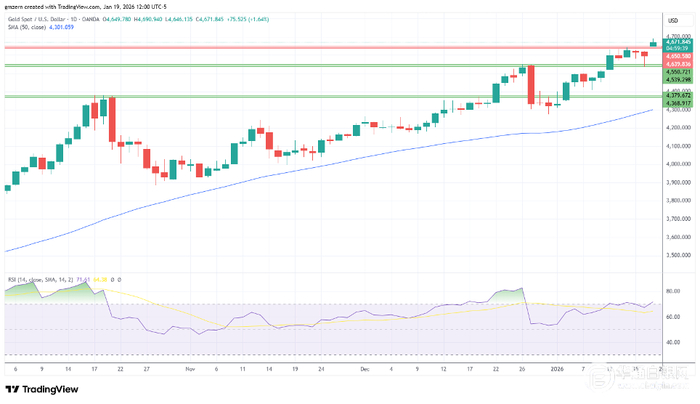倘若黄金价格持续高于4640-4650美元阻力位,则将会向4800美元水平攀升。