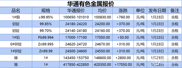 华通白银网 1月23日讯:1#铜、铝锭(99.85%)、铝锭(99.70%)、1#铅、1#锌、0#锌、镍、锡报价