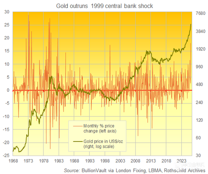 截至今日,黄金价格已突破5000美元大关。作为“避险”资产,黄金在1999年9月大幅上涨了17.3%。当时,欧洲各国央行决定限制并协调未来的黄金销售,这引发了黄金价格的大幅飙升。此前,由于黄金价格处于近二十年来的最低水平,各国央行纷纷削减了黄金储备。