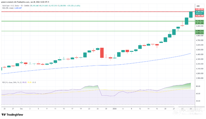 【华通白银网1月29日讯】•黄金试图稳定在5300-5310美元阻力位上方。