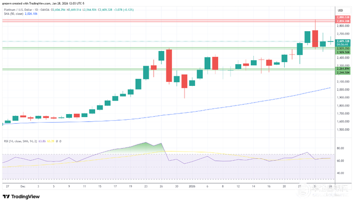 如果铂金价格回升至2700美元上方,则将会向2860至2880美元阻力位移动。