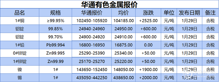 华通白银网 1月29日讯:1#铜、铝锭(99.85%)、铝锭(99.70%)、1#铅、1#锌、0#锌、镍、锡报价