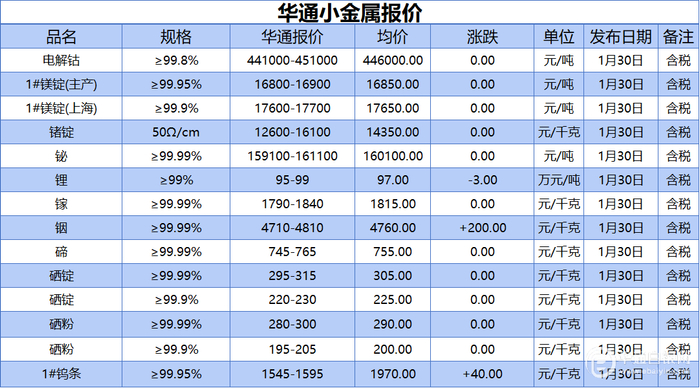 华通白银网 1月30日讯:电解钴、1#镁锭(生产)、1#镁锭(上海)、锗锭、铋、锂、镓、铟、碲、硒锭(99.99%)、硒锭(99.9%)、硒粉、硒粉(99.9%)、1#钨条报价