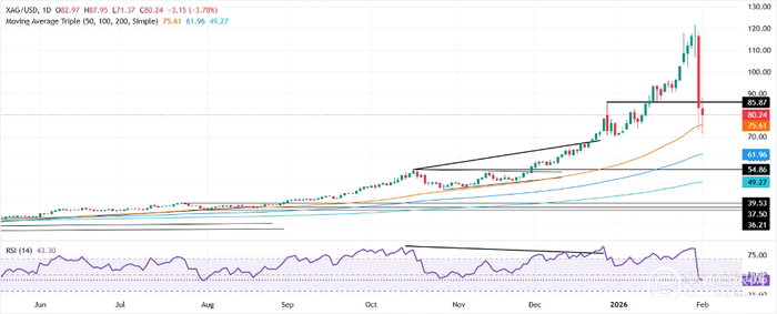 •白银价格接近80.40美元,随着相对强弱指标(RSI)显示下行压力增大,市场动能转为看跌。
