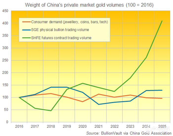 在过去十年里,终端用户黄金需求的年度总重量一直保持相对稳定,上海金交所的黄金交易量的重量也一直保持稳定。但相比之下,上海期交所的衍生品交易在过去三年中大幅增长,通过上海期货交易所合约交易的黄金名义价值在2022年至2025年期间增长了229.1%。