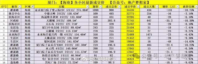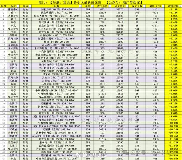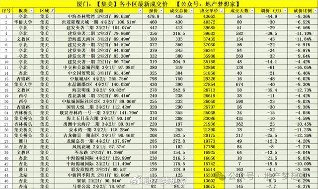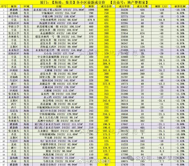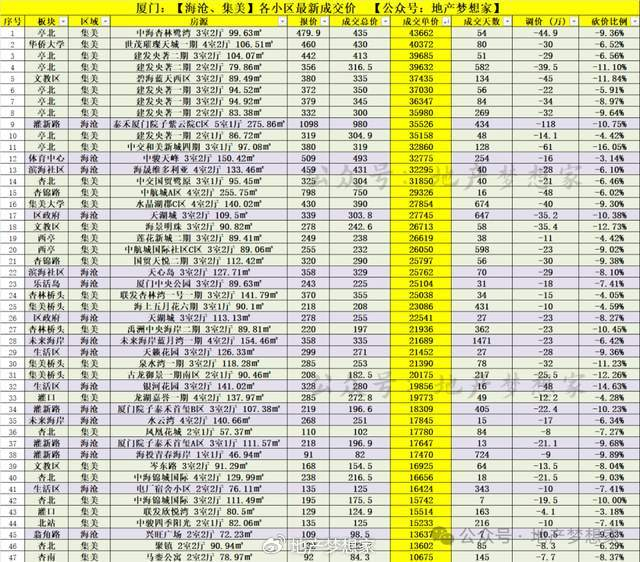 一、成交单价:海沧和集美区,最新部分热门小区的成交记录,成交单价由高到低排序,如下图表:
