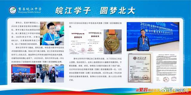 蒋布尔同学的故事,是皖江中学教育成果的一个缩影。2020年,他从美国回国后转入皖江中学初中部。 凭借着对数学和信息技术的浓厚兴趣,以及自主学习的强大能力,蒋布尔在老师的鼓励下踏上了竞赛之 路。