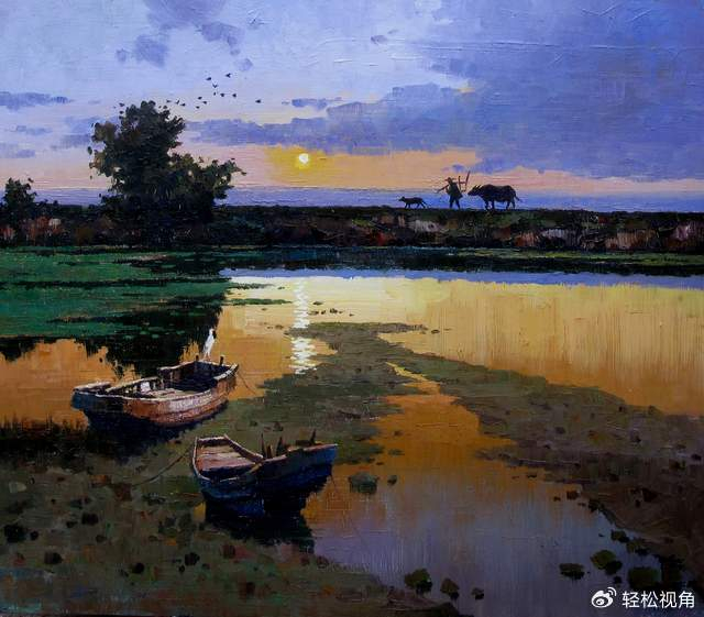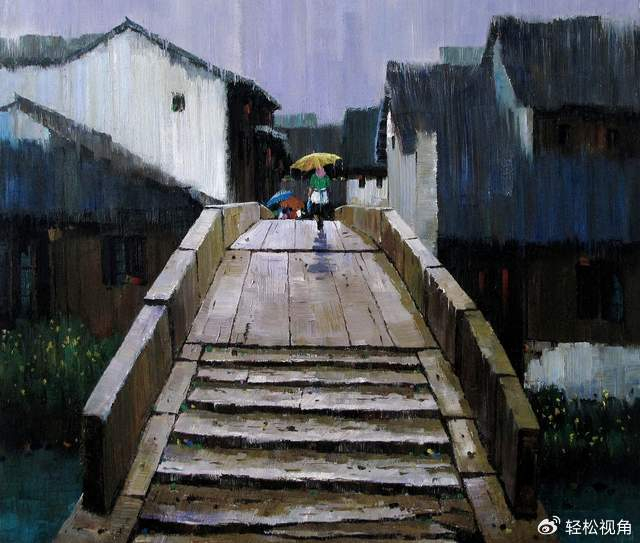 在技法层面,他突破了媒介的界限。其油画作品,远观色彩饱满、层次丰富、光影交织,尽显西洋油画之厚重与表现力;近睹则可见笔意流淌、墨韵宛然,勾勒晕染间深得中国书画笔法之精髓。他对画面“空灵”感的营造,对“意境”而非单纯“实景”的追求,使得其作品在写实的框架内,洋溢着浓厚的象征意味与诗性哲学。如水乡常见的“桥”,在其画中不仅是连接两岸的建筑,更隐喻着古今对话、中外沟通的通道;那氤氲的“水气”,既是江南地理特征的描摹,也是时光流转、文化浸润的视觉化表达。