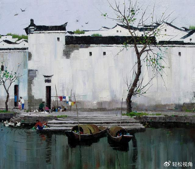然而,无论走得多远,故乡始终是他创作灵感的源头活水。皖南的粉墙黛瓦、桨声灯影、蒙蒙烟雨,早已化为其艺术DNA中不可或缺的片段。他承继先师“到人民中去、到生活中去”的嘱托,数十年来潜心以江南水乡为母题进行深耕。在张振家的画笔下,江南不再是单纯的风景再现,而是升华为一种文化符号与精神家园的象征。他巧妙地将水墨画中“气韵生动”、“虚实相生”的美学原则,与油画丰富的色彩表现力和立体塑造感相结合,创造出一种既熟悉又新颖、既民族又世界的视觉诗篇。这种“东方意境,西法呈现”的独特风格,逐渐成为其作品中辨识度极高的艺术指纹。